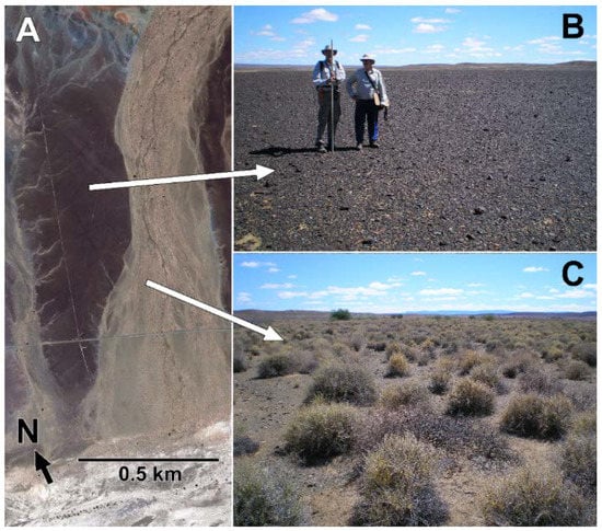 At the Tankwa Karoo site (Figure 6), infiltration rates measured on the pavement and adjacent Holocene alluvial surfaces differed by an order of magnitude. Average infiltration on the pavement (two measurements at different locations) was only 0.07 mm/s; but was 0.83 mm/s on the Holocene surfaces (six measurements at different locations) (surface infiltration measured by recording the time required for infiltration of the equivalent of 20 mm depth of water applied within a 190 mm diameter ring pressed into the soil surface). Due to the high moisture-holding capacity of the vesicular A horizon and associated extremely low infiltration capacity on the pavement, deep percolation and leaching is impeded, thereby leading to accumulation of salts, delivered to the surface through various forms of atmospheric deposition e.g., [36]. Within the pavement soil, total soluble salt contents of the vesicular A horizon and underlying B horizons were approximately 20 times and 70 times that of the average salinity of all soil horizons sampled on adjacent Holocene alluvial surfaces (Table 3). Similar, highly-saline soil environments beneath barren stone pavements have been reported for other desert regions [68,75,80,82,83,84]. Although the fine-textured vesicular A horizon by itself directly affects vegetation due to its inhibiting effect on infiltration and percolation of precipitation [77,79], the accumulation of such high salt contents ultimately contributes to an extremely hostile physiological environment for most plants. In highly-permeable soils with loamy sand textures that lack high salt concentrations, such as the Holocene alluvial surfaces next to the Tankwa Karoo pavement, relatively dense perennial vegetation can be supported by the meagre average precipitation of this arid region (Figure 6C). Cladoraphis spinosa, the dominant perennial plant on those surfaces, has a dense fibrous root system largely restricted to the upper 20–30 cm of the soil (personal observations of excavated plants). This indicates that the low precipitation of this area (~100 mm/year or less), can support vegetation in soils with a high infiltration capacity and corresponding non-saline conditions.