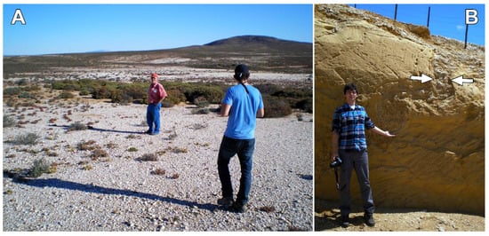 (A) Co-author M.T. Hoffman (left) and research assistant M.P. King in a Knersvlakte quartz pavement landscape, 42 km north-northwest of Vanrhynsdorp, Western Cape Province, located 0.5 km west of Highway N7. Note the white pavements on gentle footslopes of the distant hillslope. Coordinate of site: −31.2669° S, 18.5477° E, 257 m elev. (B) M.P. King points out a quartz vein (between arrows) in highly-folded, readily-weathered shale. Excavated exposure 25 km north-northwest of Vanrhynsdorp to the west of Highway N7. Coordinates: −31.3993° S, 18.6580° E, 124 m elev.
