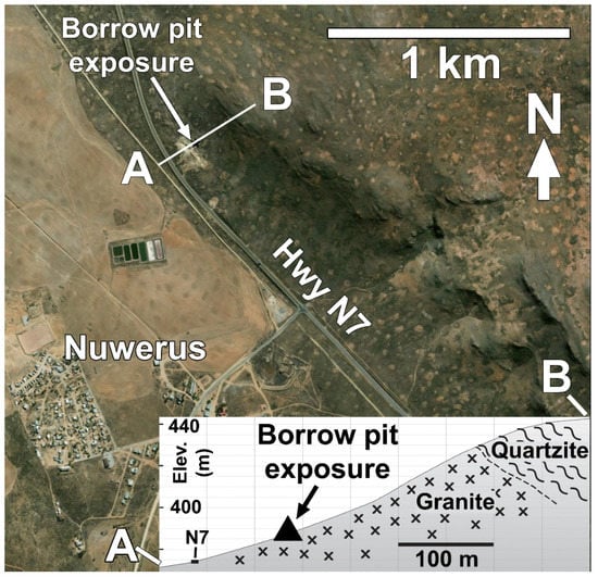 A site examined one kilometre north of Nuwerus, Western Cape Province contains a hillslope with a curvilinear profile (Figure 11). Two different kinds of bedrock underlie this hillslope. The footslope and backslope are underlain by late Proterozoic, medium-coarse grained leucocratic granite of the Namaqualand granite-gneiss complex [34,92]. Weathering-resistant quartzite of the late Proterozic Nama Sequence [34,93] unconformably overlies the granite [94]. The quartzite prominently outcrops on the shoulder and summit of the slope (Figure 11 and Figure 12A). Angular, cobbly quartzite colluvium derived from those outcrops continuously mantles slopes below the outcrops all the way to the footslope.