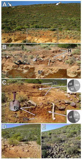 (A) Upslope view across the borrow pit location north of Nuwerus. The white arrows at the top of the view indicate outcroppings of quartzite. The white rectangle in the lower centre is shown in enlarged view below in (B); (B) View of the borrow pit exposure showing the continuous line of quartzite cobbles, beneath which is the reddened Bt soil horizon (centre of view) and weathered granite (gr). The downslope edge of a heuweltjie (H) is exposed in the section and contains lighter-coloured, silt- and fine sand-rich soil materials; (C) Close-up view of the well-developed, reddened Btk horizon beneath the quartzite cobbles. The Cr horizon consists of weathered granite with little clay accumulation. Light-coloured soil materials of the heuweltjie are emplaced on the top of the layer of quartzite cobbles. Note the continuity of the layer in the exposed section of the heuweltjie in the centre. Pie diagrams show the percentages of sand (sa), silt (si), and clay (cl) as measured with the hydrometer method; (D) The margin of borrow pit exposure to the immediate north of the view in (C) showing the surface layer of quartzite colluvium, with the reddened Bt horizon beneath it (lower left corner beneath hammer); (E) Backslope location showing the surface clad in a continuous mantle of angular colluvial cobbles, derived from outcrops further upslope.