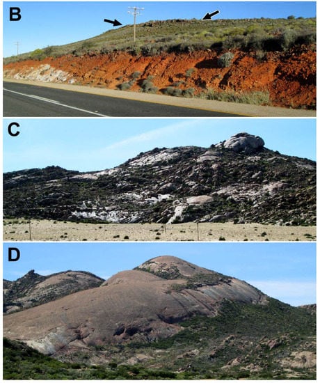 At the Sandia Mts. site studied by Persico et al. [95], slopes lacking aplite dikes and associated mantles of coarse colluvium mainly exhibited corestone topography dominated by exposed bedrock, with limited and patchy soil cover. Where soils are present on these hillslopes, they typically consist of thin A horizons directly over a thin C horizon and weathered bedrock (Cr). The dominant mode of weathering of granite is grussification, yielding granule-sided and smaller particles. Those materials are readily removed by surface runoff, preventing the accumulation and lengthy retention of sediments required for sustained soil profile development. As a consequence, rather than the smooth, curvilinear profiles exhibited by slopes mantled by aplite colluvium, the exposed granite slopes at the Sandia Mts. site displayed rugged, irregular corestone relief. Similar contrasts are evident in South African landscapes. For example, the Namaqualand granite-gneiss complex is exposed in an area of about 70,000 km2 in the northwestern corner of South Africa. In places where relatively weathering-resistant rock types outcrop above granitic units like the Nuwerus site, accumulations of weathering-resistant, coarse colluvium over the more weathering-prone rocks creates conditions that enhance dust entrapment, soil formation, development of smooth, curvilinear slope profiles, and continuous vegetation cover (Figure 13A,B). Areas dominated by the same kinds of granitic rocks, but lacking units capable of generation weathering-resistant colluvial mantles exhibit profoundly different slope forms including exposed corestones and domed inselbergs (bornhardts). Such landforms are characterized by processes including exfoliation or sheeting [102], combined with grussification, which generate relatively fine materials that are efficiently removed from the slopes (Figure 13C,D).