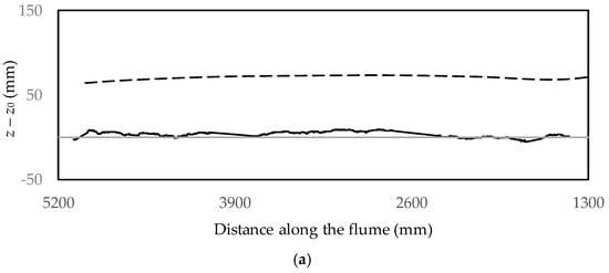 Longitudinal profiles of the water surface (dashed) and bed elevation (continuous) at (a) 70 s, (b) 80 s, and (c) 90 s from the beginning of sediment feeding for the sample experiment. The original bed elevation z0 is indicated by the gray line. Note the flow from right to left, consistently with Figure 10, Figure 11 and Figure 13.