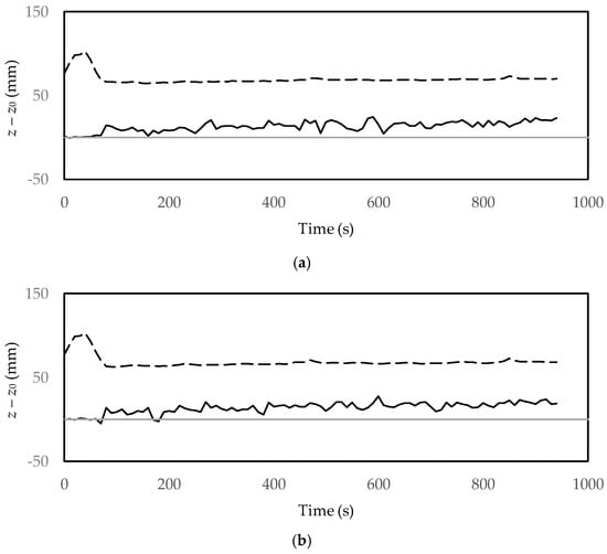 The morphologic evolution of the channel was surveyed for 17 min, after which the experiment was stopped due to limited availability of sediment to be fed into the flume. The channel bed profile at several times and the temporal evolution of the bed elevation at some locations are depicted in Figure 15 and Figure 16, respectively. The water surface elevation is also presented in the plots. The initial bump in the time evolution of the water surface elevation in Figure 16 corresponds to the initial channel regulation (increasing the flow rate and lowering the tailwater condition). Some irregularities are still present in the bed profiles that are mostly due to stickers attached to the flume wall (see Figure 13). These mistakes can be manually removed for a subset of profiles used in following analysis of the results. However, the measurements enabled the key features of the morphologic evolution to be observed, with the simultaneous downstream propagation of an aggrading sediment front (at 1800 and 2340 mm for times of 80 and 90 s, respectively) and dunes. Arguments on how the two morphological features can/should be separated were given, for example, by [,], but are beyond the scope of the present paper.
