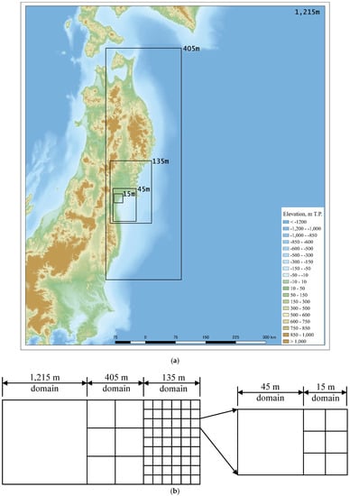 To obtain the tsunami inundations for different infrastructure-system conditions, a numerical tsunami simulation was conducted with the TUNAMI-N2 model []. The simulation was run on a computational domain using a nesting grid system, from large areas to small areas, along the coastline of Sendai City. The TUNAMI-N2 model was first developed at Tohoku University to model tsunami propagation and inundation on land and operates using the nonlinear theory of the shallow water equation, which is solved using a leap-frog staggered-grid finite difference scheme. The nonlinear shallow water equation is shown by Equations (1)–(3), wherein the finite difference method is applied to run the nonlinear equation with the bottom friction represented by Manning’s roughness coefficient.