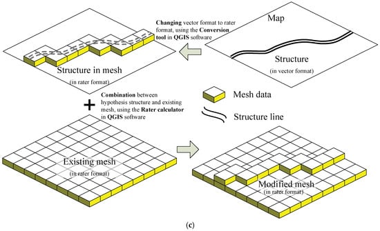 Bathymetry data to compute tsunami propagation and inundation. (a) The largest modeling domain with a 1215 m grid size. The black boxes represent the grid for smaller domains; (b) The ratios of different grid sizes; (c) The method of inserting the hypothesized infrastructure into the existing mesh.