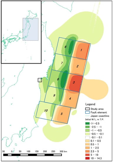 An important variable for simulating tsunami propagation and inundation is the initial seafloor deformation that is computed from the fault modeling of the tsunami source model. Because of the complexity and uncertainty of the fault rupture processes, this study estimated the initial water level based on a rectangular fault model and assumed that the change in the sea surface is the same as the seafloor deformation. The rectangular faults are assumed to have a fast movement toward the sea surface that is only a vertical displacement []. The fault parameter of the 2011 Great Pacific Coast Japanese earthquake is based on the Tohoku University model []. The Tohoku fault model (V. 1.2) establishes 10 subfaults. Figure 3 presents the initial water level distribution generated by the Tohoku University model based on the Okada formula [] where the maximum water level or uplift is about +14.3 m T.P., while −4.7 m T.P. is the minimum water level or subsidence. The T.P. datum is the Tokyo Peil datum referenced by the sea water level in Tokyo bay [].