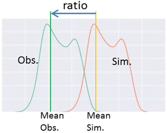 where is the mean of the observed data, is the mean of the simulated data, is the corrected data, and is the simulated data. The ratio value is calculated using the cross validation method [], as shown in Figure 4. The advantage of this technique is that the bias value is removed from the mean, whereas its disadvantage is failing to correct the time series data.