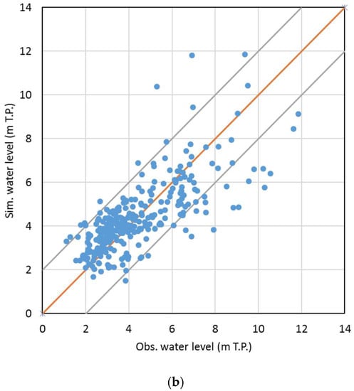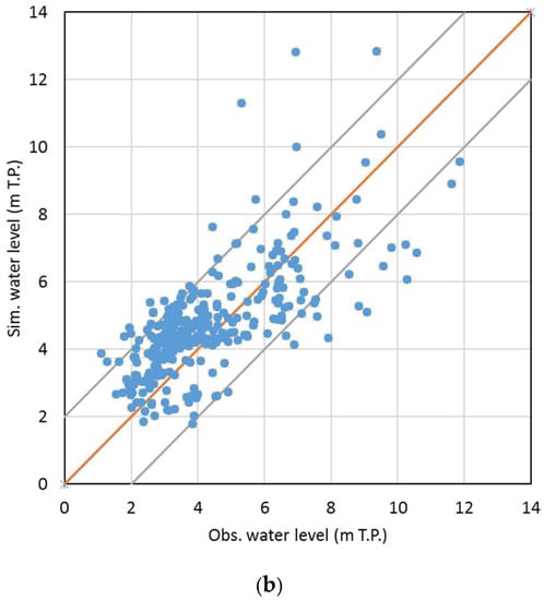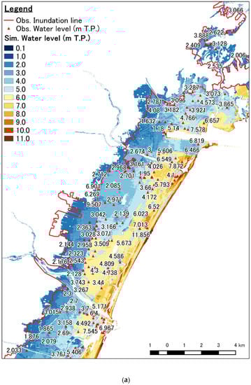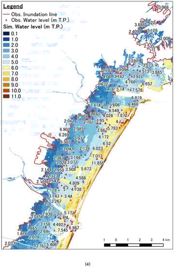 The tsunami run-up height from the numerical simulation based on the Tohoku University fault model and bathymetry data with existing structures present during 2011 (Case 09) was calibrated using field measurement data, as shown in Figure 5. Figure 5a presents a comparison of the inundation extent with the inundation line provided by the Geospatial Information Authority of Japan []. Scatter plots of the observed and simulated data are shown in Figure 5b, wherein is 0.874 and is 1.359.