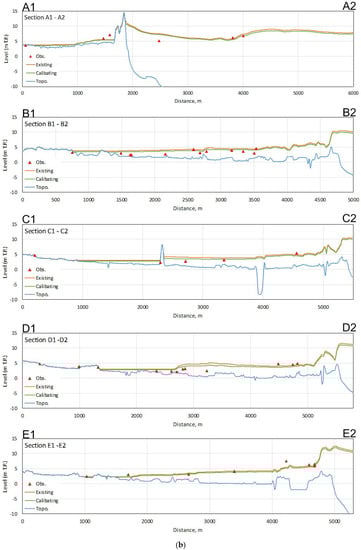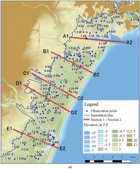 In this study, the observed water level data have a mean value of approximately 4.314 m, whereas the existing runs have a mean value of approximately 4.749, indicating that the simulation results overestimated the observed data. The bias correction parameter is approximately 0.908 and was used to improve the existing initial water level. The bias parameter was multiplied with the spatial existing initial water level. The improved initial water levels have a maximum value of approximately +12.6 m and a minimum of approximately −4.1 m. Comparing the corrected data with the existing data, the maximum increases by approximately 0.6 m, while the minimum decreases by approximately 1.7 m. The modified initial water level is input into the TUNAMI-N2 model again for the inundation simulation, and the simulated results were used for the validation, as shown in Figure 6. Figure 6a shows the validation of the inundation extents with the inundation line, while the scatter plot of the observations and simulations is shown in Figure 6b using a of 0.957 and a of 1.339, which agree well with the mentioned form of the JSCE. The evaluation of the simulation results in a spatial scheme. For a detailed evaluation, Figure 7 shows five cross sections of the simulated terrain inundation. Sections A and E represent the outside of the protected area to the north and south of Sendai City, respectively. The other sections, Sections A, B, and C, are in the reconstruction area. The evaluations of the sections reveal that the corrected model is closer to the field measurement data than the existing model.