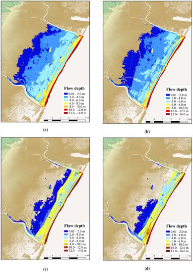 Some examples of the inundated regions for different sets of multiple prevention structure conditions: (a) case 01; (b) case 09; (c) case 22; and (d) case 23.