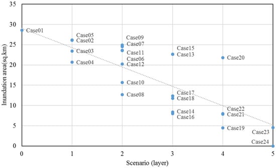 The performances of the multilayered structures for tsunami protection were evaluated by the inundation area, flow depth, velocity and arrival time. The simulated results based on the 2011 Great Tsunami were derived from 24 cases of different geometric scenarios of tsunami protection. The inundation results for some cases are shown in Figure 8 as a spatial map. The number of inundation areas at each depth and the ranges of the areas are shown in Table 2 and are separated into 5 classes. These classes are based on the prevention area represented in Figure 1, and the inundation area within the prevention boundary is shown in Figure 9 with each combination scenario.