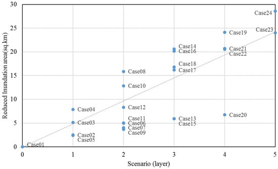 Other results show a significant difference in the inundation of the protected areas for several combinations of structures. The reduced inundation areas were calculated by computing the difference between case 01 and other cases. The performance of each case shown in Figure 10 are based on the reduction of the inundation area compared with the nonstructural case (case 01). Case 04 (with the elevated road) is the highest performing single-structure scheme, while the highest performing 2-layer scheme is case 08 (existing seawall and elevated road). For the 3-layer scenarios, the highest performing case is case 14, which combined the existing seawall, a new seawall, and an elevated road. Case 19 is the combination of the existing seawall, a new seawall, a greenbelt, and an elevated road and has the best performance of the 4-layer scenarios.