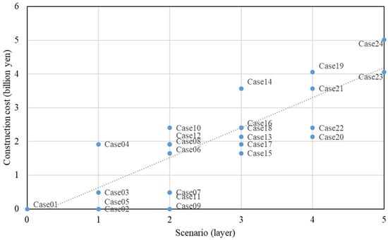 The construction costs for the 3 structures (the seawall, greenbelt, and road) are the costs for reconstructing and introducing new components to protect against future tsunami disasters in Sendai City. The construction costs are based on the established materials needed for Sendai City to construct the elevated road, which assumes either a unit length or a unit area. The construction cost of the elevated road is a base cost required to estimate the construction costs of the other structures, such as the highway and seawall. The elevated road cost is approximately 1.92 billion yen for a length of 10.2 km []. The construction material is assumed to have 2 components: the cost of building up the earth and road and the manpower cost, which is assumed to account for approximately 75% of the material cost. The assumptions used to estimate the construction cost above is used for the other structures, such as the seawall and the highway. Table 3 shows the cost of the 3 structures in which the unit cost is based on the material cost of the elevated road. The cost of each structure is used to calculate the construction cost for each protection case. Figure 11 shows the construction cost in each case within the scenario groupings.
