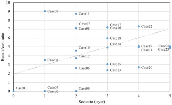 The economic value of the Tohoku region can be obtained from the Research and Statistics Department Minister’s Secretariat Ministry of Economy, Trade and Industry (METI), Japan. The total economic cost is approximately 57,267 billion yen for the total area of approximately 66,890 sq. km for the Tohoku area []. Given that, the economic unit area cost is approximately 0.856 billion yen per sq. km, a value that can be used to estimate the benefit of protection. Figure 12 presents the benefit/cost analysis (BCA) for each method of protecting Sendai City. The construction cost is estimated using the unit cost and the quantity of units. The benefit can be estimated by the reduction of the inundation area (protected area) plus the economic unit area cost. The BCA index can be estimated by the cost of the protected area divided by the construction cost. The trend of the BCA index for tsunami protection is increased when the number of protected lines (scenarios) increases. Thus, the layers of protection have an effect on the tsunami behavior that is reflected in the BCA.