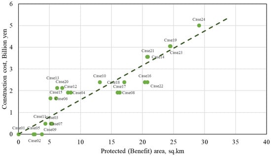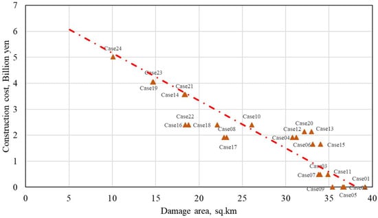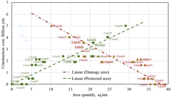 Several cases used to protect against tsunamis have provided 2 different results: those of the tsunami inundation area (damaged area) on the demand side and those of the protected area (reduction area from the nonstructural case) on the supply side. Figure 13 shows the relationship between the tsunami inundation area and the construction costs. The relationship trend decreases when the damage area increases, leading to a smaller construction cost. The relationship between the protected area and the construction cost is shown in Figure 14. The trend increases when the protected area and the construction costs increase. The optimum point is the recommended balance between the damaged and benefited areas for the optimization of the protections against tsunamis in Sendai City.