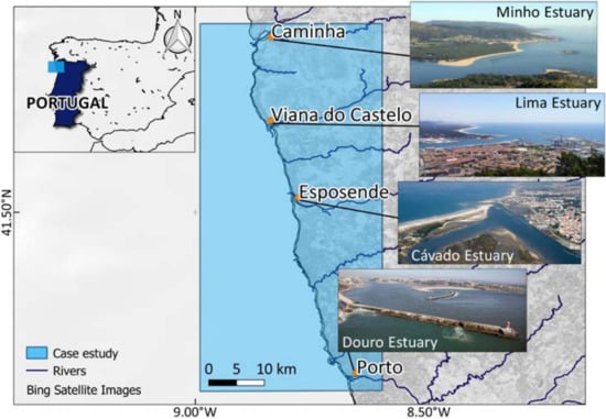 Downscaling of climate change scenarios for sea level rise assessment should be properly contextualized, since its quantification depends on a great number of complex physical processes including land subsidence changes, eustatic sea-level change, freshwater discharge variations in river deltas, and tidal range alterations []. However, for extreme short-term events like coastal storms, whose effects can be aggravated by a sea level rise, once they have become more intense and frequent already constitute a threat for coastal environments. Low lying coastal territories, which usually coincide with estuaries and river deltas, are among the most vulnerable coastal areas to the impacts of coastal storms. On the northwestern Portuguese coast we can identify four main estuaries: the Minho, Lima, Cávado, and Douro estuaries [,,], which have a considerable number of exposed areas that are vulnerable to coastal storm effects (Figure 1).