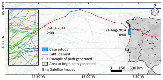 With the combination of the longitude and latitude origins, the beginning of the simulated trajectories was established in the region of the Portuguese Azores Islands. This is because it is usually at this point that a lot of the tropical cyclones occurring in the area travel towards Western Europe. There are a variety of different tropical cyclone paths that pass through this point, including tropical cyclones that reach the United States’ coast and continue to gain strength and travel across the Atlantic Ocean. In contrast, there are tropical cyclones that begin in the lower tropics and curve poleward in the mid-Atlantic very early in their development. The different types of paths are portrayed in Figure 3 []. It was decided to simulate the small part of the tropical cyclone that would reach the Portuguese coast—their tail-ends. It seemed as though this was the component that these tropical cyclones, as a group, had in common.