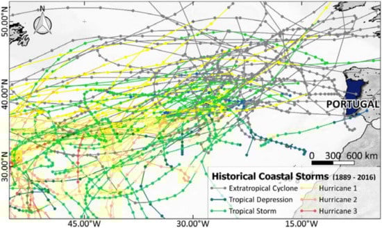 The main purpose of this paper is to study storm occurrences on the Portuguese northern coast, explore the characteristics and pathways of the tropical storms that affect the area, and most importantly, with the aid of hydrodynamic models, evaluate the vulnerability of the coast to storm surges. The variation of storm surge heights depends on numerous factors such as the tropical storm category, forward speed, radius of maximum speed, proximity of the storm trajectory to the coastal zone, bathymetry, coastal geomorphology, and shape of coastline []. As a result, numerical modeling systems are essential for a detailed forecast of the possible impacts of coastal storms. The methodology of the design of hypothetical scenarios resulting from geographical shifts of the registered historical tropical systems is presented. The main results obtained for different locations are also shown.