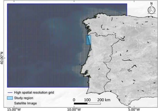One domain was considered for the Portuguese coastal region. This domain was discretized (Figure 4) with a high spatial resolution grid with 329 × 232 grid cells (cell size approximately 0.03°).