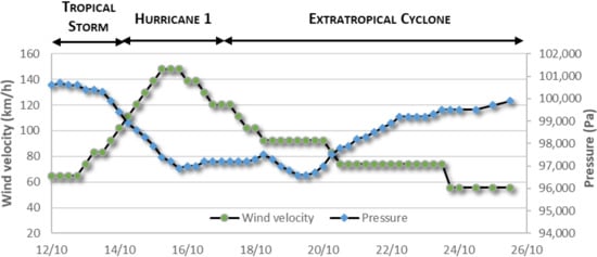 The hydrodynamic domains were geo-referenced using the WGS 84 (World Geodetic System) coordinate system. The bathymetry was based on a continuous terrain model for ocean and land with a spatial resolution of 30 arc-seconds from the General Bathymetric Chart of the Oceans, GEBCO_08 Grid []. The open boundary conditions and initial conditions were given by TPXO 7.2, a version of the global model of ocean tides []. The storm wind fields were generated using recorded data of atmospheric pressure, wind speed, storm trajectory, and velocity (e.g., Tropical Depression Rafael which occurred in 2012, represented in Figure 5). Using data available in the Tropical Atlantic’s Best Track Data database, simulations for the Portuguese coast ran using storm track information that included the latitude and longitude of the storm’s eye, the maximum sustained 1 min wind speed, the pressure drop, and the radius of maximum winds.