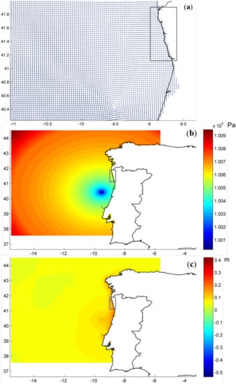 Example of coastal storm simulation results in the Iberian domain (World Geodetic System (WGS) 84 coordinate system). Rafael [], on 26 October 2012 at 04:00 a.m.: (a) Wind field (zoom); (b) Atmospheric pressure in Pa; (c) Storm surge in meters.