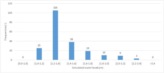 For the ensemble simulations phase, a sequence of 209 simulations were randomly created. Considering a small area within the grid corresponding to the area of interest (between the Douro and Lima estuaries), the maximum water level was obtained for all ensemble member results for that specific area. The graph in Figure 7 displays the results for the ensemble simulations carried out for the region of the Portuguese northwestern coast. Of the 209 ensemble members, 197 members resulted in a water level of less than 2 m, 152 members resulted in a water level of less than 1.5 m, 91 members resulted in a water level of less than 1.3 m, and 25 members resulted in a simulated water level of less than 1.2 m. This means that the simulated water level limits of 2.0, 1.5, 1.3, and 1.2 m covered 94.26%, 72.73%, 43.54%, and 11.96% of the total ensemble members, respectively.