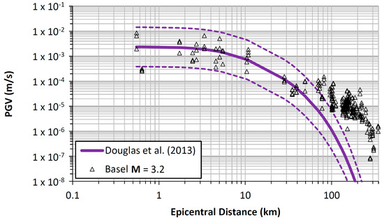 Peak ground velocity (PGV) (individual horizontal components) from the Basel M = 3.2 event along with the prediction (median and plus/minus one within-event standard deviation) from the ground-motion prediction equation (GMPE) of Douglas et al. [].