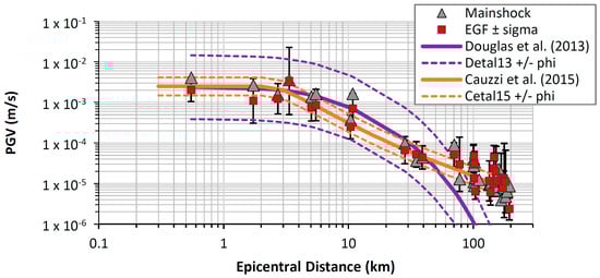 For the 54 EGF events, there were 282 recordings (each with three channels) within 100 km across 15 recording stations (427 records at 49 stations out to 345 km). The EGF predicted PGVs (geometric mean horizontal, plus/minus one standard deviation, σ) are shown in Figure 3 along with the recorded data of the M = 3.2 event, the empirical GMPE of Douglas et al. [], and the stochastic simulation-based [] GMPE of Cauzzi et al. []. Each predicted PGV is comprised of numerous individual predictions from the 54 EGF events, which facilitated the calculation of the prediction’s standard deviation. Outlier suppression at 5σ was applied to individual predictions (before averaging) to avoid adversely influencing mean predictions. The predicted PGV matched the observed values well, in some cases reflecting site-specific (within-event) offsets relative to the median PGV of the event.