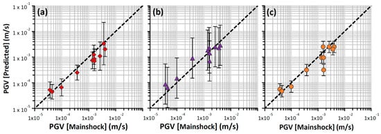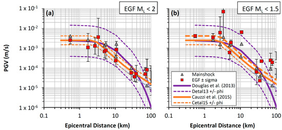 Comparison of predicted peak ground velocity (PGV) versus mainshock PGV for the empirical Green’s function (EGF) (a) and the models of Douglas et al. [] (b) and Cauzzi et al. [] (c).