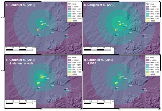 Peak ground velocity (PGV) maps (background) and M = 3.2 mainshock amplitude (triangles) for the Basel event. The background PGV maps show the predictions of Cauzzi et al. [] (a); the predictions of Douglas et al. [] (b); the interpolation of recorded PGV and Cauzzi et al. [] (c); and the interpolation of empirical Green’s function (EGF) predictions and Cauzzi et al. [] (d). The triangles in each map are coloured according to the recorded PGV at each station.
