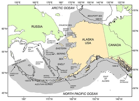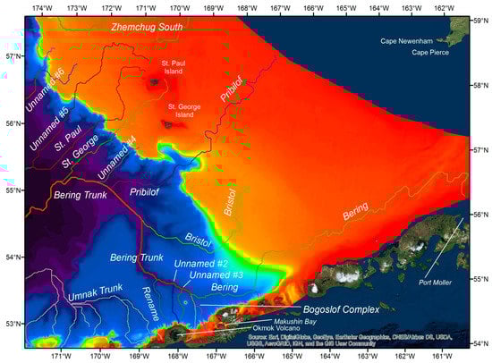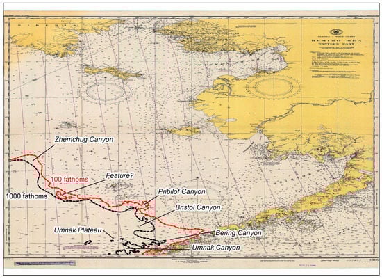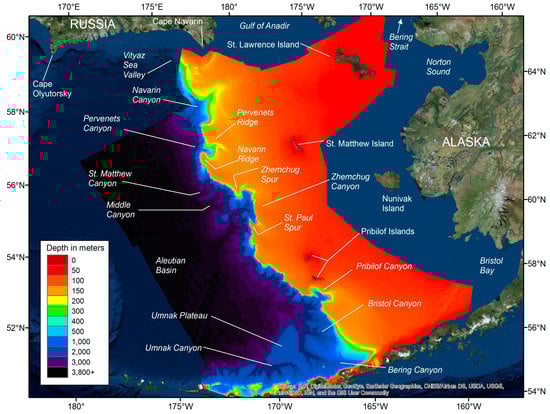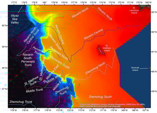 A global analysis of canyons was conducted using the ETOPO1 data set [], producing 26 thalwegs within our study area. Additional seafloor features in the EBS slope area were defined from Shuttle Radar Topography Mapping (SRTM30_PLUS) in another global analysis []. Locations and names of seafloor features—mostly canyons—were available from GEBCO (https://www.gebco.net/data_and_products/undersea_feature_names/) and the National Geospatial Intelligence Agency (NGA, Springfield, VA, USA: https://www.ngdc.noaa.gov/gazetteer/).