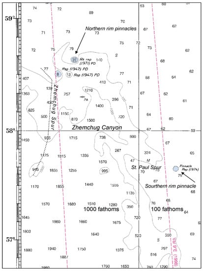 There are four pinnacles reported to be in the Zhemchug Canyon area (Figure 3). Discoveries of previously unknown and dangerous pinnacles, such as the 650 ft (198.1 m) tall “Washington Monument” pinnacle in South East Alaska, rising to a depth of just 2.75 fathoms (5.0 m), have been a very real reminder of the danger for navigation in Alaska’s uncharted waters for over a century []. The Zhemchug Canyon pinnacles are legendary and members of the research, environmental, and commercial fishing communities are all familiar with their vague and inconvenient location in relatively deep water along the edge of the Bering Sea self.