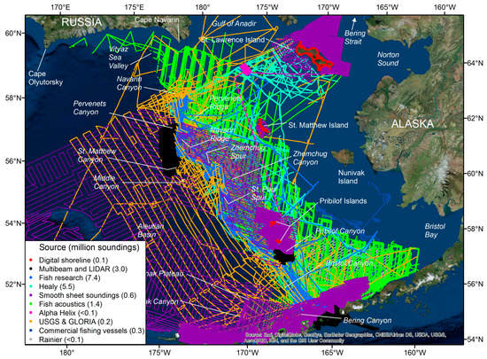 Global and regional bathymetry compilations of various bathymetric sources have advanced our knowledge of the Alaska seafloor. Global bathymetry surfaces of 2 arc-minute resolution (~3704 m) [], 1 arc-minute resolution (~1852 m) (ETOPO1: []), and 30 arc-second resolution (~926 m) (General Bathymetric Chart of the Oceans, GEBCO: []) were published using a mixture of soundings and calibrated remote sensing data. Regional bathymetry compilations include those of the AKRO (National Marine Fisheries Service, Alaska Regional Office (Anchorage, AK, USA): https://alaskafisheries.noaa.gov/, variable resolution, 2005; updated to 40 m resolution in 2017, https://inport.nmfs.noaa.gov/inport/item/27377), the International Bathymetric Chart of the Arctic Ocean (IBCAO 3.0, 500 m resolution, []), and the Alaska Regional Digital Elevation Model, which is a compilation that includes US and Russian chart soundings (ARDEM, ~1 km resolution, []).