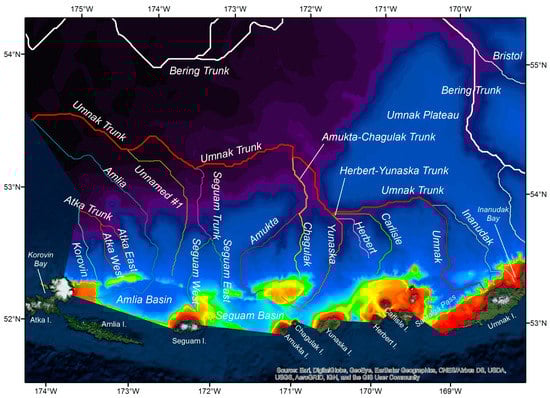 - Carlson, P.R.; Karl, H.A. Discovery of two new large submarine canyons in the Bering Sea. Mar. Geol. 1984, 56, 159–179. [Google Scholar] [CrossRef]