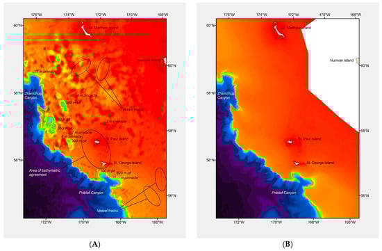 Comparison of eastern Bering Sea bathymetry between (A) the global GEBCO compilation [] with numerous artifacts in the area between Zhemchug and Pribilof canyons and (B) our bathymetry which depicts a much smoother surface.