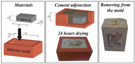 In order to study the behaviour of the cement/caprock interface, original batch experiments were designed. The clayey rock of a Callovo-Oxfordian age (COX) was selected to represent the caprock in this experiment. This geological stratum is intensively studied within the framework of the geological storage of nuclear waste in France (ANDRA; e.g., [25,26,27]). XRD analyses of the Callovo–Oxfordian clay rock reveal a dominant argillaceous phase (45% illite and interstratified illite/smectite), a calcium carbonate phase, mainly calcite (25%), and a siliciclastic phase, mostly quartz (25%). Other phases (feldspar, pyrite) and organic matter have been observed, but in mass quantities of less than a few percent [28]. The cement studied is class G Portland cement and was prepared according to the API-ISO 10426A norm (349 ± 0.5 g of water mixed with 792 ± 0.5 g of cement). This cement is classically used in the petroleum industry and is also the subject of several works on the geological storage of CO2 (see for example [29]). The hydrated cement is mainly composed of residual bi/tri calcic silicate (C2S, C3S), portlandite (Ca(OH)2), and a fibrous matrix of calcium silicate hydrated (CSH), which confers its mechanical properties. The samples were prepared according to the following protocol. Firstly, a piece of caprock (25 × 17 × 10 mm) was placed in the middle of a silicone mold (35 × 30 × 20, Figure 1). The caprock was previously hydrated for one hour with deionized water in order to prevent cement fracturing during the drying phase. Then, the cement paste was added to fill the mold. The samples were set for 24 h at ambient temperature and finally were removed from the mold.