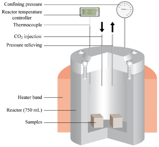 The samples were then placed vertically into a 250 mL reactor (Figure 2). The first step of the experiment was curing the samples for seven days in an aqueous solution composed of deionized water with 30 g·L−1 of NaCl. The cure consists of the hydration of the samples in the ageing conditions of pressure and temperature (100 bar and 80 °C). At the end of the cure, the reactor was depressurized and one sample was removed (as a blank sample). The reactor was re-pressurized at 100 bar and re-heated at 80 °C, and the ageing lasted for 30 days. During the cure and ageing processes, temperature was regulated but pressure was only monitored. The experiments were carried out with and without the aqueous solution (Figure 3), and with CO2 or N2 (selected as an inert gas). Samples aged with N2 were compared to samples aged in the presence of CO2. In total, eight samples were tested and analyzed. During the cure, the W/R ratio (ratio between the mass of water and the total mass of solid: cement paste + caprock) ranged from 1.66 to 1.95 and varied between 1.88 and 2.34 during the ageing.