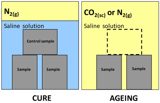 Experimental protocol. On the left side, cure conditions: the samples are completely immersed in the saline solution with an N2 gas cap. On the right side, after the cure, one sample is removed from the reactor for the initial state study and the remaining samples are aged either under dry conditions or with a saline solution. The gases are N2 (blank experiment) and CO2.