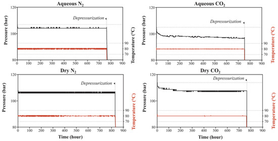 The pressure and temperature monitored during the entire duration of the experiment are the first available data (Figure 4). These two parameters allow, in the batch experiment, to visualize any significant chemical change in the reactor. For each experiment (N2 with and without solution, CO2 with and without solution), the temperatures are constant at 80 °C. Concerning the N2 experiments, after a rapid pressure decrease, the system reaches an equilibrium state. The decrease of the initial pressure is 3 bar with aqueous solution, and 1 bar without solution. Concerning the ageing with CO2 with and without aqueous solution, the decrease of the pressure is more important. It is 9 bar with solution and 6 bar without solution. The pressure decrease is faster during the first hours of the experiment, and then it slows down. The decrease is continuous for the experiment with solution but the pressure reaches a sill after 200 h for the experiment with dry CO2.