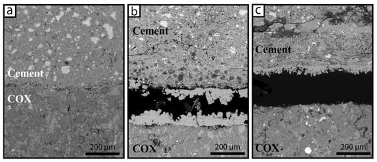 SEM observations of the cement/caprock (COX) interface (back-scattered electrons). (a) N2 + solution experiment; (b) CO2 + solution experiment; (c) dry CO2(sc) experiment.