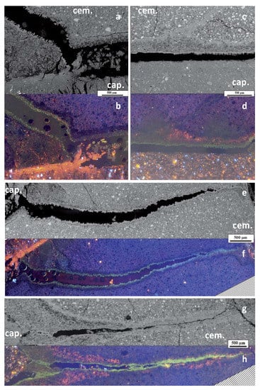 In order to better constrain the chronology of the complex evolution of the samples, the observation was focused on cracks in the cement sheath. Observed carbonation profiles are similar to those observed on the caprock/cement interface. With the aqueous solution (Figure 7e,f), the alteration of the cement occurs according to a front (dissolution + carbonation) of about 80 µm thick. The “red” carbonation phase is not present in the fracture. Only the “green” phase develops on both sides of the crack. It is of note that the crack opening is larger close to the caprock/cement interface (left side) than close to the external side of the cement sheath (right side). This can be used to interpret the direction of the crack propagation. With dry CO2(sc) (Figure 7g,h), the two phases of carbonation are observed in the cement. The alteration front presents a variable thickness and covers a range from 150 µm (right side) to 500 µm (right side). As with the solution, the crack is larger close to the interface with the caprock.