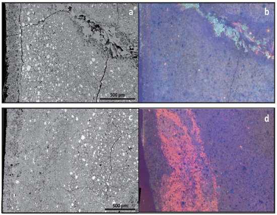 The observation of the external part of the cement directly in contact with either dry CO2(sc) or CO2 + solution gives information on the mechanisms of cement alteration. In particular, measurement of the alteration front provides constraints on the fracture genesis and on the kinetics of the propagation front. Concerning the experiment with aqueous solution (Figure 8a,b), the carbonation front in the cement is on average 160 µm thick. Notice that no “red” carbonates are present from the CL image observation (Figure 8b). For the experiment with dry CO2(sc) (Figure 8c,d) the alteration front is thicker: 700 to 1000 µm. Here, the “red” carbonates are characteristic of the altered cement.