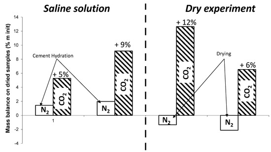 The carbonation level of samples can be evaluated by a mass balance performed by weighing the samples before and after the experiment. The initial weight was obtained 24 h after sample preparation and after exposition at ambient temperature. The final mass was measured 24 h after the end of experiment, also after drying at ambient temperature. Notice that the remaining amount of water after drying can vary from one sample to another and has to be considered as the main uncertainty of the mass balance. The results of weighing, as a percentage of the initial mass for the different samples, are given in Figure 9. The mean gain of 1.7% for the samples aged with N2 + solution is probably due to the hydration of the sample (cement phases mainly) after one month of the experiment. In contrast, the mean loss of 1.8% in mass of the samples aged with dry N2 can be explained by the dehydration caused by the evaporation of water coming from the porosity of the samples heated at 80°C for one month. Considering that a fluctuation of about ±1.8% can be attributed to hydration/dehydration phenomena, some significant differences still remain if looking at the mass balance of the samples aged with CO2. A mean gain of 6.7% in mass for the experiment with the solution and of 8.7% for the dry experiment indicates the level of cement carbonation. This mass balance confirms that the carbonation of the samples aged with CO2 under dry conditions is more extensive than that with the aqueous solution.