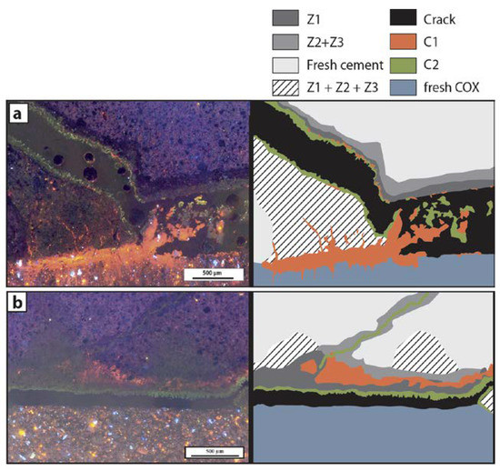 From the observation of the cement and of the caprock/cement interface, three main steps of carbonation occurred in experiments performed with CO2. The different zones are illustrated in Figure 10 and are in agreement with the literature (e.g., [9]). The numbering of zones is taken from Sterpenich et al. [7], adapted from Kutchko et al. [16]. The first carbonation phase described is associated with calcium leaching from the cement, which corresponds to zones Z2 and Z3. Z3 is the zone at the interface with the fresh cement; it corresponds to a calcium-depleted zone due to portlandite dissolution and CSH leaching. Z2 is just behind Z3 and is the zone of the first carbonation (dark zone in CL) among the remaining CSH matrix. It is of note that in this same zone, ghosts of C2S or C3S replaced by hydrated silica and which can be considered as a source of calcium for the surrounding carbonates are present. The second phase is represented by the carbonates with a red to orange luminescence (C1) and widely affects the claystone located close to the caprock/cement interface. The third phase is represented by the carbonates with the green luminescence (C2) with an aragonite shape which covers the walls of the cracks. Z1 corresponds to a porous zone and is the result of a partial dissolution of precipitated carbonates and the dominance of hydrated silica. The luminescence colours of C1 and C2, red and green, respectively, indicate that C1 is likely calcite, and C2 aragonite [30,31], which is consistent with other published studies on cement carbonation.