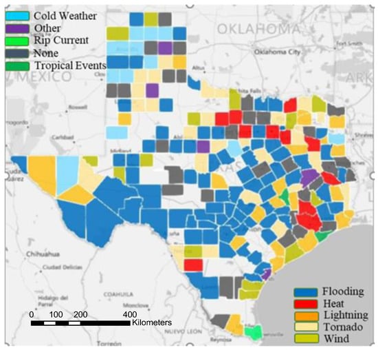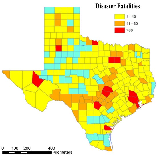 This study analyzes fatality rates resulting from multiple hydrometeorological disasters that affect the state of Texas at the county level. Texas has a long history of devastation by natural disaster (especially hydrometeorological disasters). The most lethal natural disaster in United States history occurred in Galveston Island, Texas in 1900 in which an estimated 6000–12,000 people died as a result of the “Great Galveston Hurricane”. From January 1960 to December 2016, Texas had the highest number of fatalities in the nation in which natural disasters killed an average of 40 people per year []. During this period, Texas accounted for 7.4% of all U.S. fatalities (32,289). Flood, heat, and tornado accounted for 60% of all fatalities in Texas during this period. Texas also ranks highest in fatalities per capita (15 fatalities per 100,000 people). During this period two Texas counties ranked in the top ten across all states for the occurrence of disaster events: Harris County (1088 events) and Tarrant County (1009 events). Dallas County, Texas, ranked eighth in the number of fatalities in the U.S. Extensive research has been conducted to investigate the quantitative and qualitative aspect of flooding in the state of Texas [,].