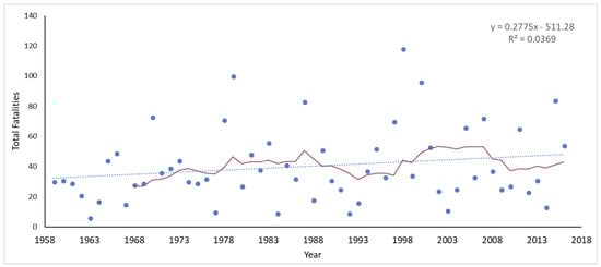 An average of 42 fatalities per year occurred in Texas from 1959 to 2016 with a median of 33 fatalities per year and a total of 2330 hydrometeorological fatalities. The difference between the mean and the median indicates that the annual distribution is positively skewed with long tail in the right direction (towards higher numbers). Although, the raw number of fatalities exhibits a slight increasing trend during the study period, the trend has low linearity (R2 = 0.0369, p = 0.233) and the relationship of fatalities over time is statistically weak (Spearman’s p = 0.16). The lowest number of fatalities (6) occurred in 1963 and the highest number of fatalities (118) occurred in 1998 (Figure 2). Eleven of the 58 years had an annual number of fatalities greater than the 58-year mean plus one standard deviation (40 ± 24).