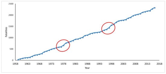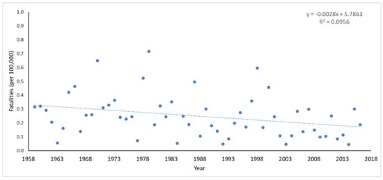 The data analysis includes temporal and spatial trending using linear trendlines and correlation analysis to verify statistical significance. Moving 10-year averages were also included to in the temporal distribution to support the linear trending. Spatial analysis by county used the ArcGIS (v.10.4) (Esri, Redlands, CA, USA) to generate thematic maps. Fatality rates were normalized by annual population for temporal trends and by the study period median population for the spatial distribution by county. Percentages were generally rounded to the nearest whole number unless otherwise necessary for comparative analysis.