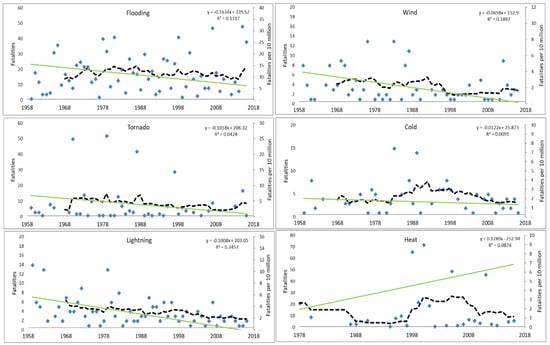 Annual fatality rate in Texas for six disaster types: flooding, wind, tornado, cold, lightning, and heat: 10-year rolling average (dashed line) and normalized (fatalities per 10 million) trend line (green solid). Note: Heat fatalities are reported from 1978 to 2016.
