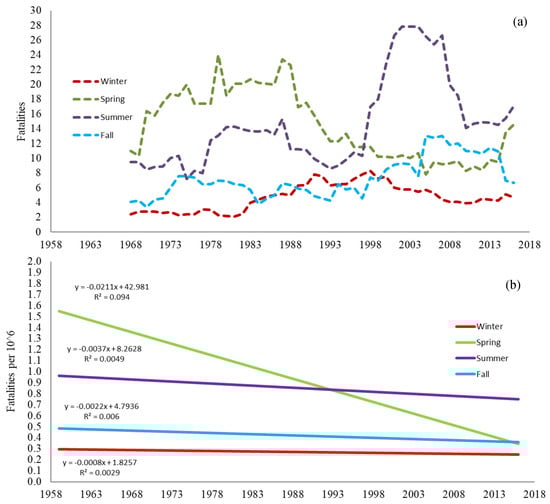 (a) Number of total fatalities (rolling 10-year averages) by season; (b) Normalized fatality rates by season.