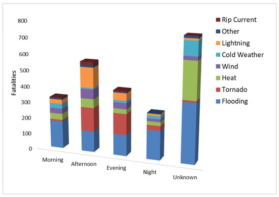 Time of day was provided for 68% of the hydrometeorological fatalities culled from the Storm Data. Each time of death was assigned to one of the four periods in a day: morning (6 a.m.–12 p.m.), afternoon (12 p.m.–6 p.m.), evening (6 p.m.–12 a.m.), and night (12 a.m.–6 a.m.). Of the fatalities with known time of death, 36% occurred in the afternoon, 26% in the evening, 21% in the morning, and 18% at night. Eighty percent (80%) of the fatalities with unknown time of the day were caused by flooding or heat-related events. Fifty percent (50%) of the total fatalities (562) that occurred in the afternoon were due to tornadoes and flooding. Detailed analysis shows that flooding events have a slightly higher chance of causing death at night or in the morning hours. However, tornados are much more likely to fatally strike in the afternoon/evening hours (Figure 8).